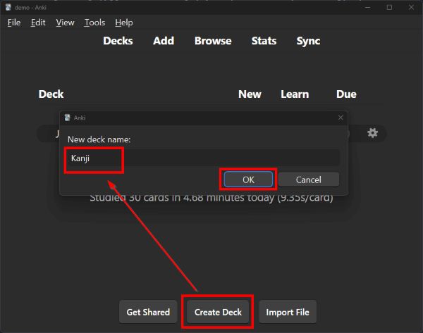 This step is simple. Click the Create Deck button at the bottom of the main Anki window, then name your new deck something like “Kanji.” You’ll want this to be separate from your regular Japanese vocabulary/sentence deck.